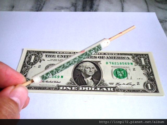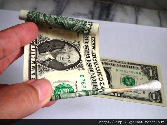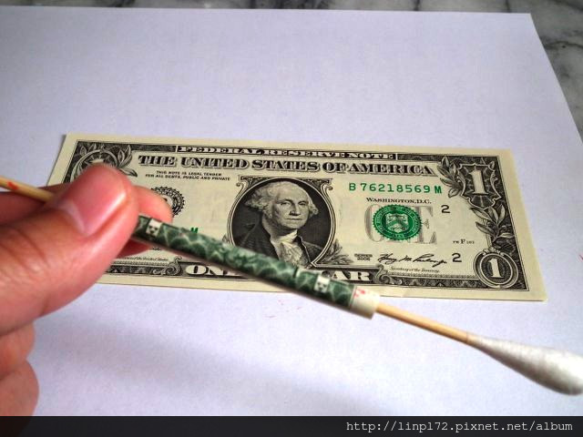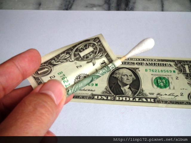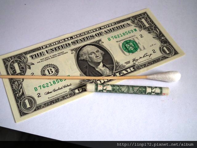首先準備棉花棒和紙鈔 /從一端壓住棉棒開始捲動,(可以將紙鈔稍微捲一下比較順)